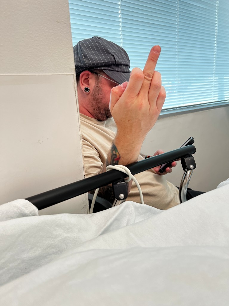 The hubby stayed strong, forced the issue and made that lazy ass walk to my wing where the security guard was corrected by the medical staff who told them that absolutely my husband can visit. It was a funny deserved moment that security guard got.