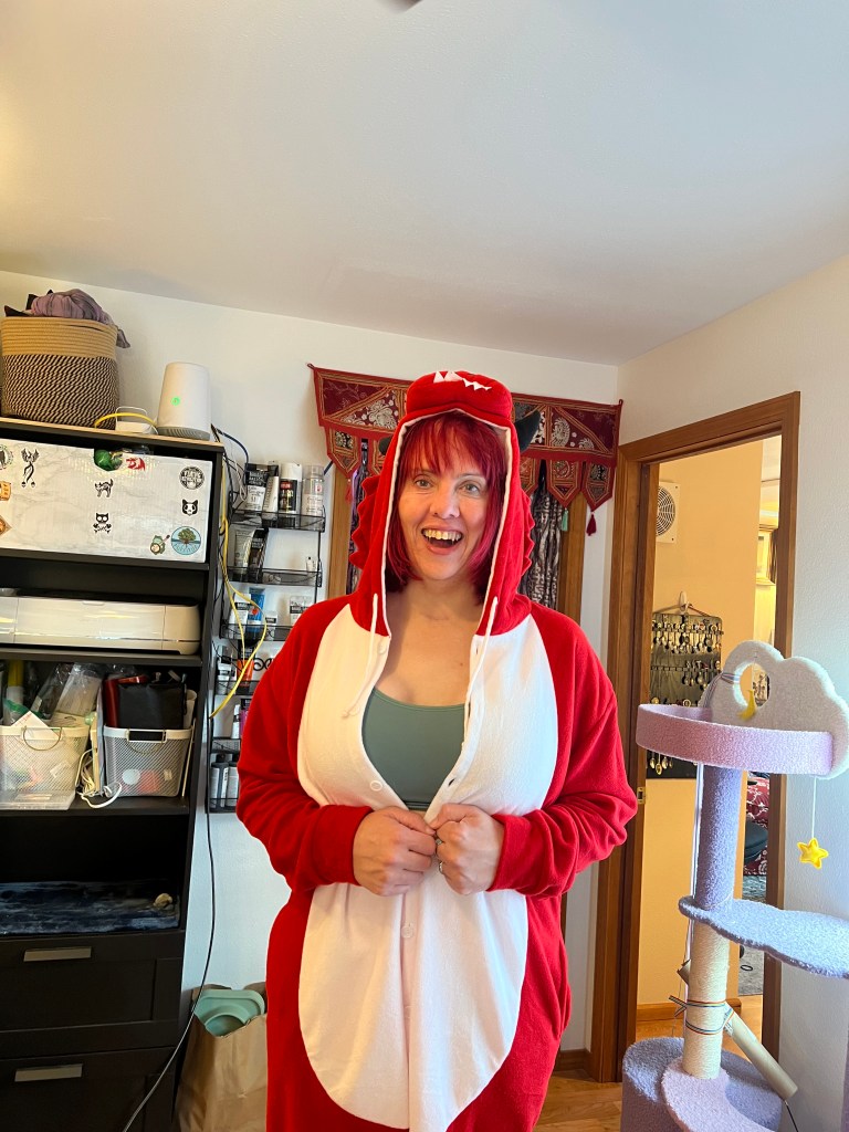 That being said, we were watching the anime “The Iceblade Sorcerer Shall Rule the World” and one of the side characters wears a dragon onesie. I thought it was cute as hell (and I still think so, even without pot in me). Next thing I know, another package rolls up and the hubby presents me with a red dragon onesie and I fucking love it.
